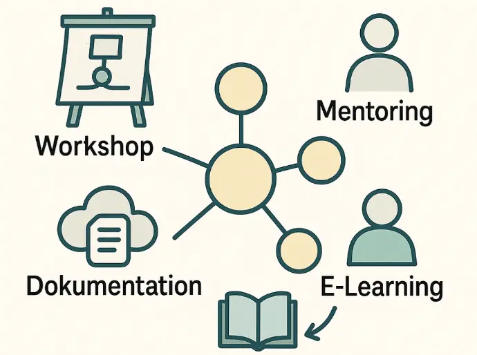 Practical knowledge is passed on directly in mentoring and coaching formats. This is supplemented by train-the-trainer concepts that strengthen multipliers within the organisation. Video tutorials and screencasts provide low-threshold access to training content – location-independent, repeatable and understandable.